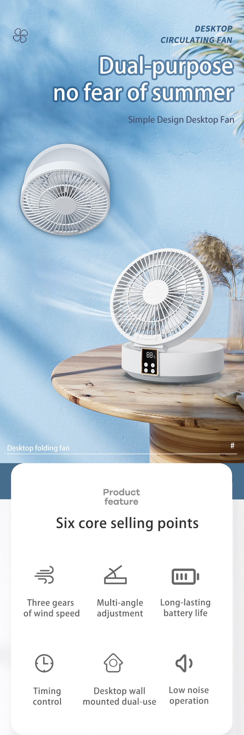 1. 2 in 1 dual-use,both a desktop fan and a wall-mounted fan;